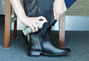 Apply shoe stretch spray to the inside of your boot to relax the material for stretching. Alternatively, you can wipe the inside of the boot with a cloth saturated in shoe stretch spray.