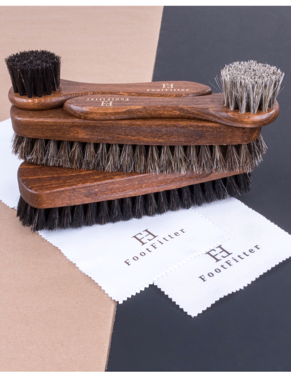 The experts at FootFitter know we have the solution for all your shoe polishing needs. With the FootFitter Essential Shoe Brush Set, you've got the perfect set of brushes to keep your shoes looking shiny and new. So whether you're cleaning your shoes or applying polish, this set has got you prepared. All brushes in the collection are made in Germany and fit into the included FootFitter gift tin that doubles as a convenient container for brush storage. Let's take a look at what's inside: