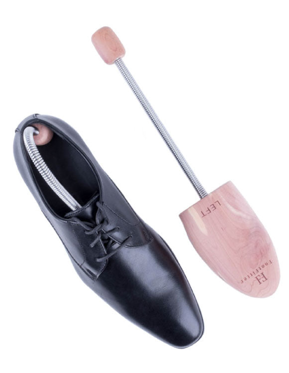 The FootFitter Travel Cedar Shoe Tree is the perfect solution to keep your shoes in shape and prevent unwanted creases while on the go. These lightweight shoe trees are crafted with a fully shaped toe block and contoured heel block. Red Tennessee Cedar absorbs moisture inside the shoe, preventing odor. The metal spring support allows flexibility and will remain secure once inserted.